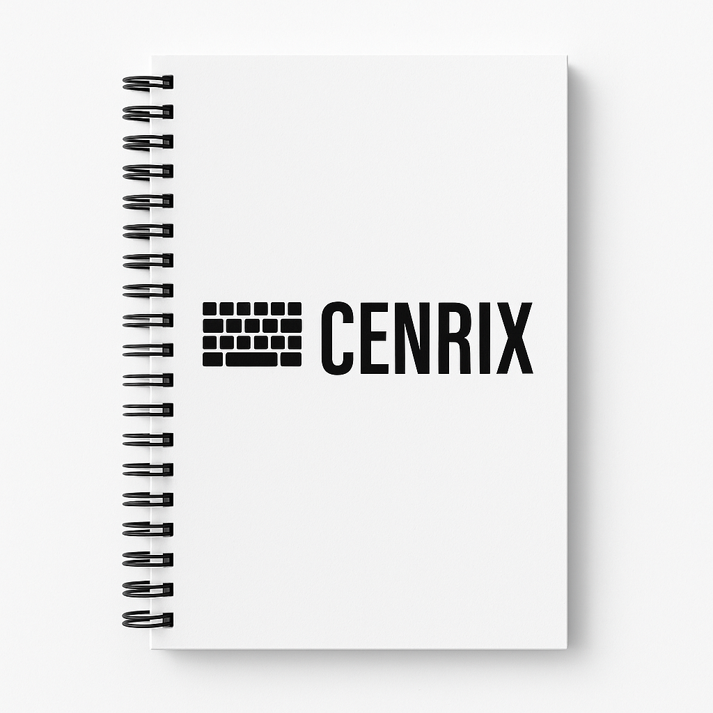 Minimalist spiral-bound notebook with a matte white hard cover and the bold black CENRIX logo centered on the front. Ideal for notes, planning, and creative ideas.