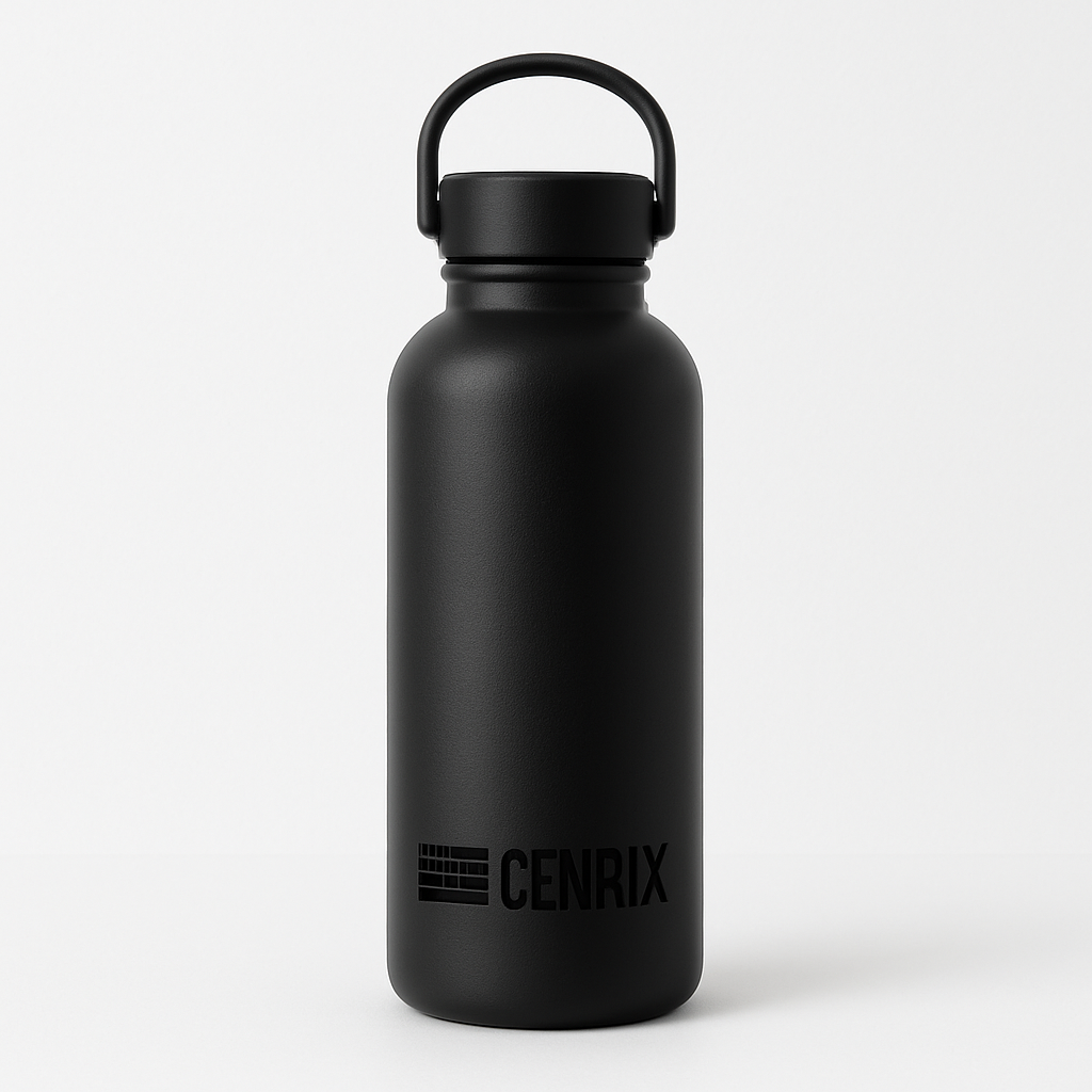 Matte black stainless-steel water bottle with a minimalist CENRIX logo. Keeps beverages hot or cold for hours — ideal for office, gym, or travel.